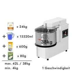 Teigknetmaschine – 42 Liter / 38 Kg – 2 Geschwindigkeiten – Mit Festem Kessel